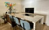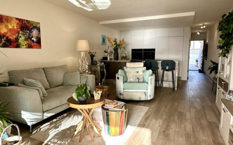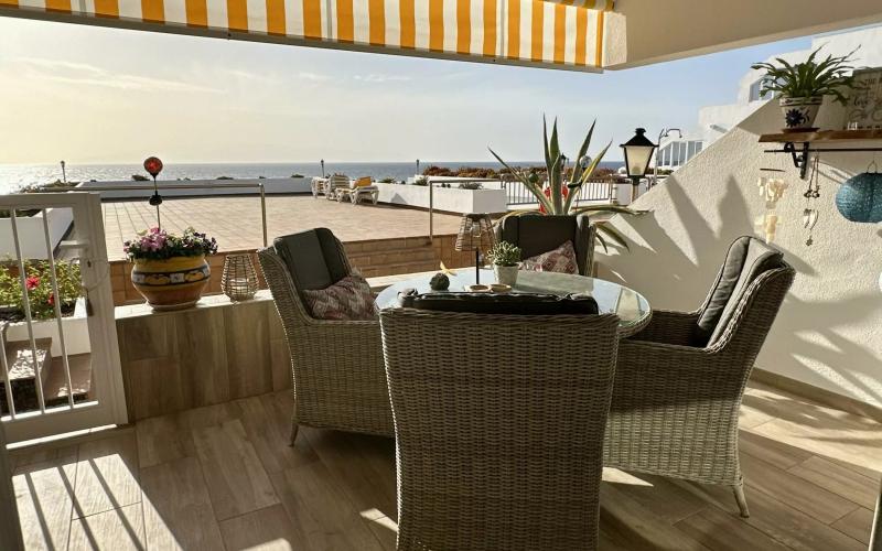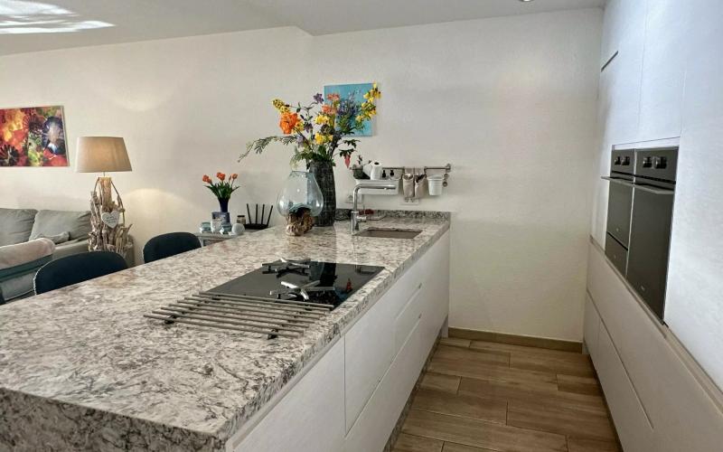 This fully refurbished, beautifully presented apartment is located in the sought-after, front-line complex of La Riviera. Offering easy access with minimal steps, this property boasts a large double bedroom with fitted wardrobes and access to the rear terrace, great sized bathroom with walk in shower, a fantastic, fully equipped, open plan kitchen with island and lounge. The main terrace accessible from the living area offers beautiful views out to sea and to the communal swimming pool and also benefits from all afternoon sunshine. The rear terrace accessible from the bedroom benefits from morning sunshine and also ideally used as an afternoon cool retreat. Situated within a well maintained complex with heated communal swimming pool. Parking space included.