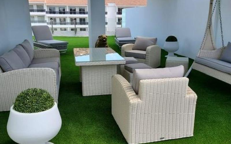 Upper floor with huge terrace with artificial grass, outdoor furniture; semi covered, ideal as a chill out area.