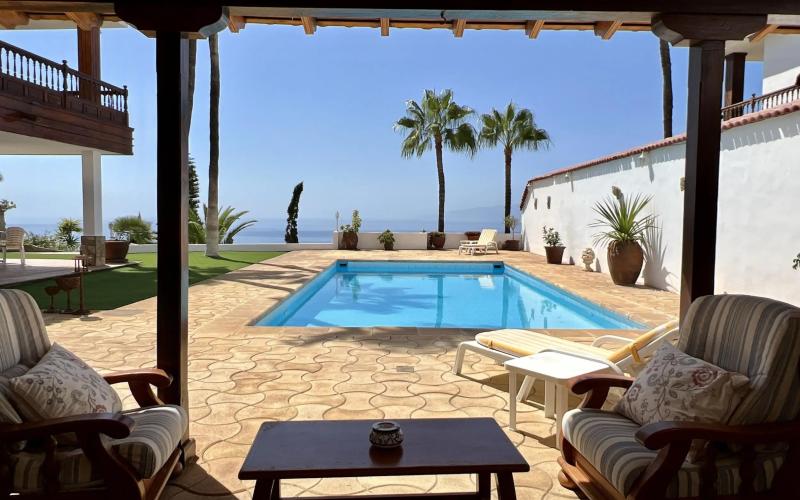 This fabulous sized unique house is situated just outside of Los Gigantes in the quiet urbanization of El Lajial. Constructed over two levels this unique property is based within its own private grounds offering extensive terraces and gardens, private pool, outside bar, barbecue area, outside dining and the most magnificent views. The main house comprises of lounge with dining area, separate kitchen, four bedrooms and four bathrooms. The property is pleasantly furnished and fully equipped. Large private roof terrace. Two large lock up garages. Tranquil area. This property is a real must see.