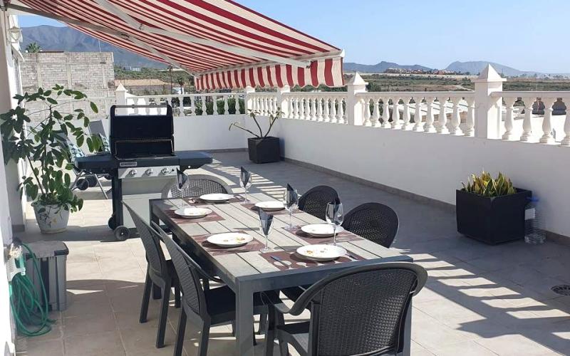 La joya de esta propiedad es, sin duda, su espaciosa terraza de 112 m². Equipada con toldo y una acogedora área de barbacoa, la terraza ofrece unas vistas impresionantes que abarcan desde la costa y el océano hasta las majestuosas montañas. Es el lugar perfecto para relajarse y disfrutar de la belleza natural que Tenerife tiene para ofrecer.